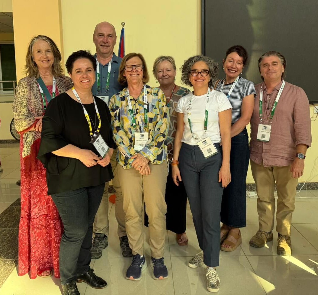 Three of four Australia ICOMOS-sponsored delegates presented at the opening plenary of the 2025 ICOMOS Annual General Assembly Scientific Symposium held in Lumbini, Nepal from 11-19 October 2025. The opening session focussed on cultural heritage destruction and recovery in conflict zones, with sponsored delegates Shireen Allan from ICOMOS Palestine, Puthikar Kong from ICOMOS Cambodia and Dr. Noureldin ELRAGIG, president of ICOMOS Sudan presenting. A fourth Australia ICOMOS sponsored EP delegate, Zuhura Mtenguzi from Tanzania, assisted as rapporteur for two further sessions chaired by Stephanie Johnston and Flavia Kiperman focussing on leveraging heritage for peace. (Below Stephanie Johnston with the delegates. Images supplied by Stephanie Johnston)